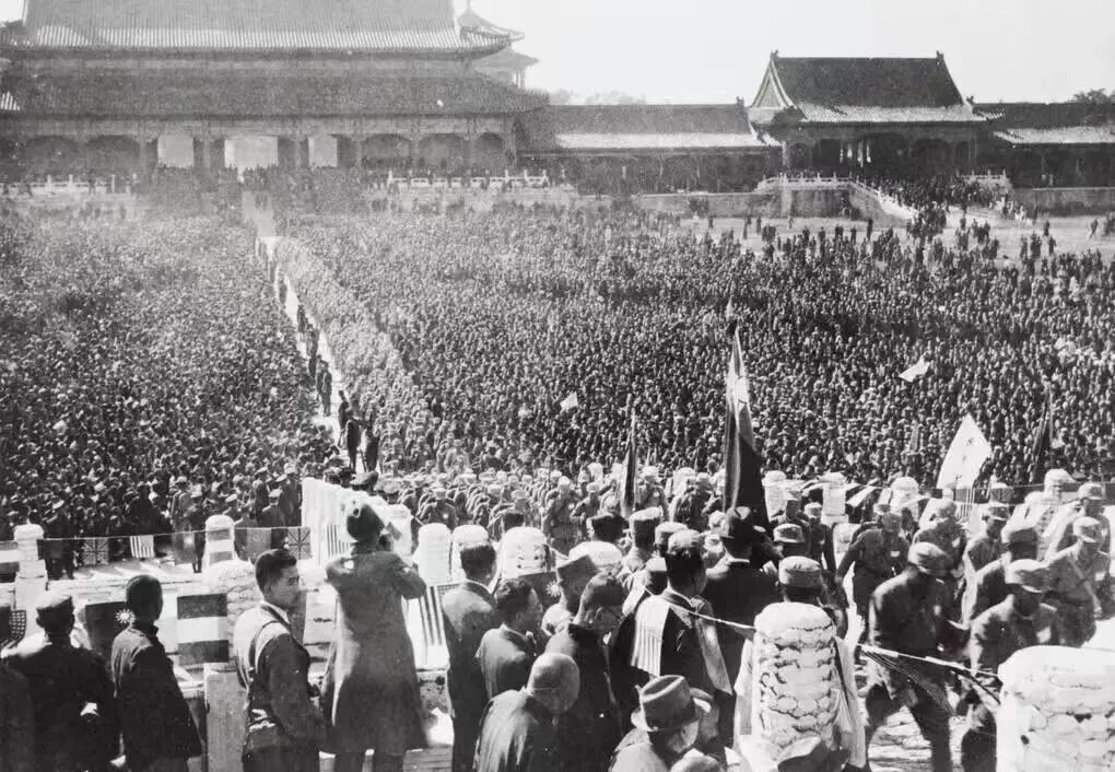 1945年10月10日,恰逢中华民国的“双十国庆节”,天气晴朗。这个清晨,身在北平的市民们,如潮水一般涌向故宫,整个太和殿广场更是人山人海,据称,人数多达二十万不止。除了北平市民,反法西斯国际阵营的代表们也参加观礼仪式,苏联代表巴斯里克耶夫、美国代表骆基中将和华顿参谋长、英国代表蓝来纳、法国代表马至礼、荷兰代表等盟国代表都赫然在列。这一天,太和殿门窗上悬挂着中、美、英、苏四国国旗,殿前摆放着写有金色“凯”字的匾额。