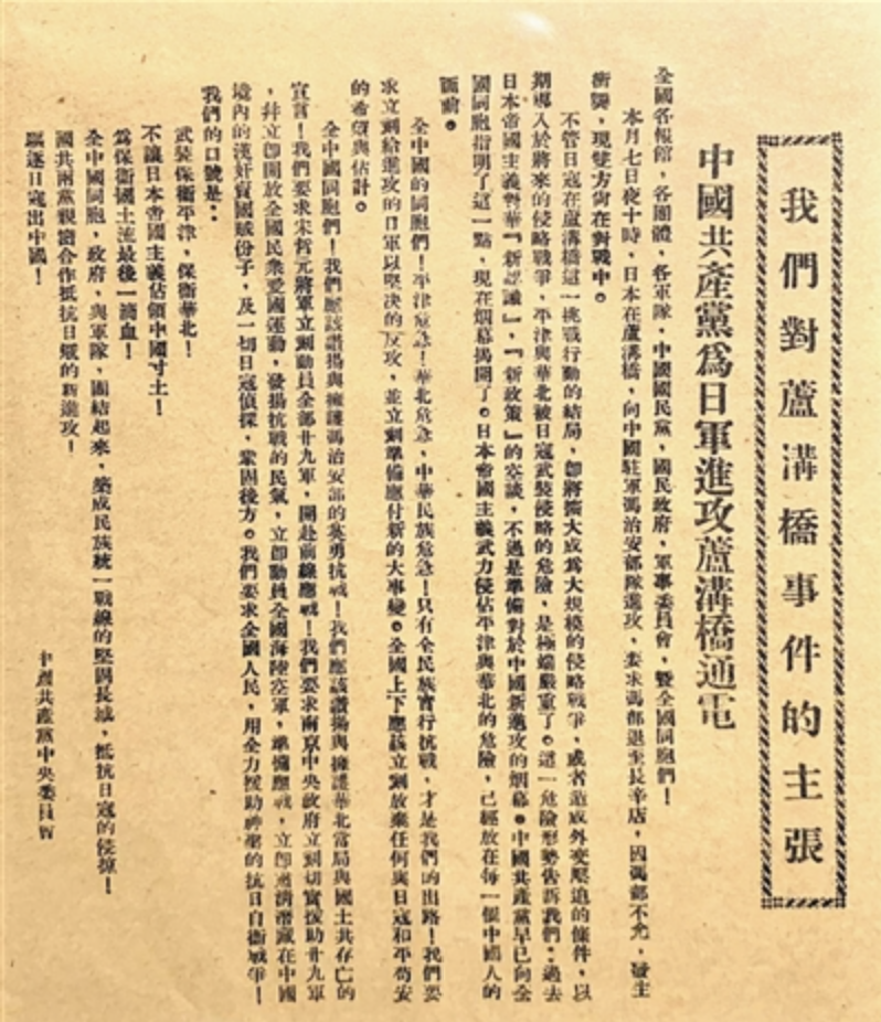 事变发生后,不同于当时的中共中央在《中国共产党为日军进攻卢沟桥通电》里明确提出的“平津危急!华北危急!中华民族危急!只有全民族实行抗战,才是我们的出路”,当时作为国家元首的蒋介石仍在考虑“倭寇在卢沟桥挑衅矣。……倭寇已挑战,决心应战,此其时乎”,因而只是电令时任第29军军长兼冀察政务委员会委员长宋哲元固守勿退。这时的宋哲元并未在任上,而正在山东安亭守孝。